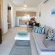 This apartment contains a living room with a dining area, an equipped kitchen, a bedroom, a bathroom, a toilet, and a terrace.
